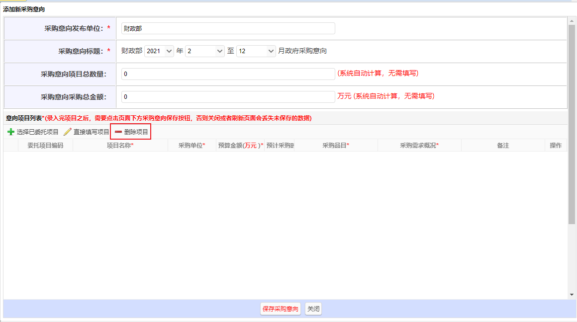 添加完項目信息后,需在【采購意向】頁面點擊下方“保存采購意向”按鈕,請勿關閉或刷新頁面,否則數據將會丟失,需重新錄入。